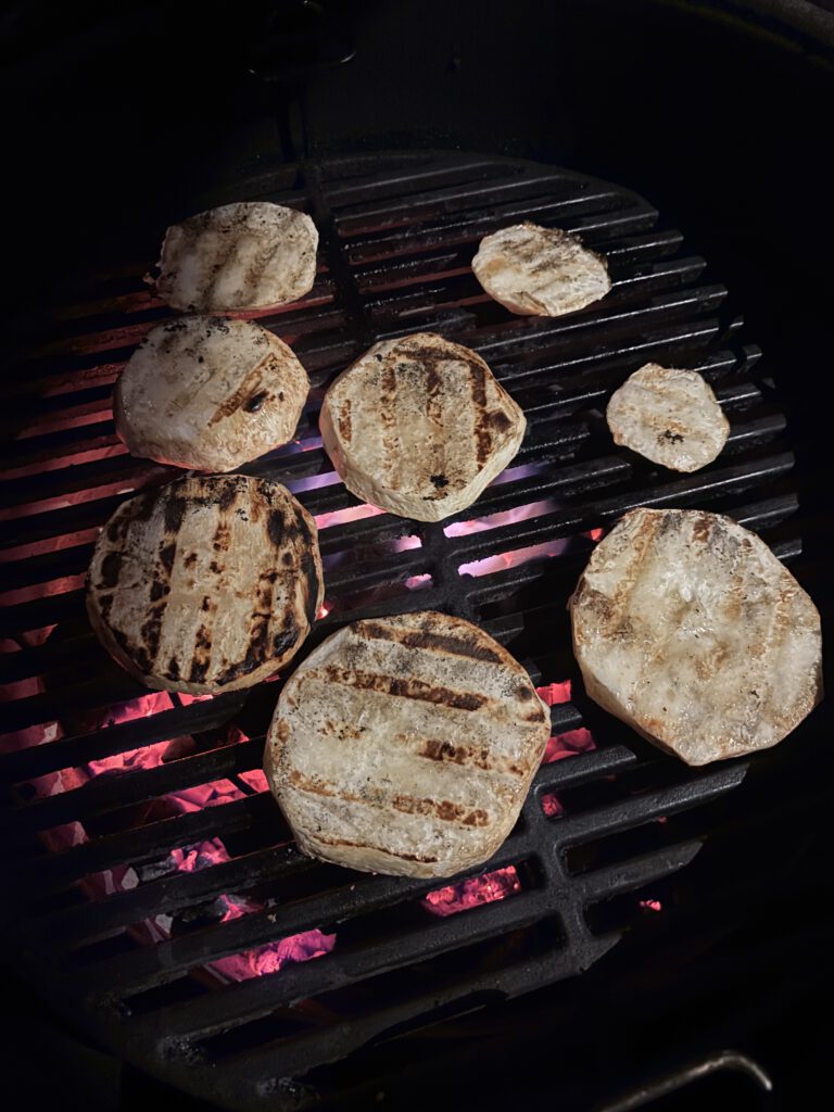 Breng de kamado naar 180–220 °C. Gebruik directe hitte met het gietijzeren rooster. - Knolselderij grillen
