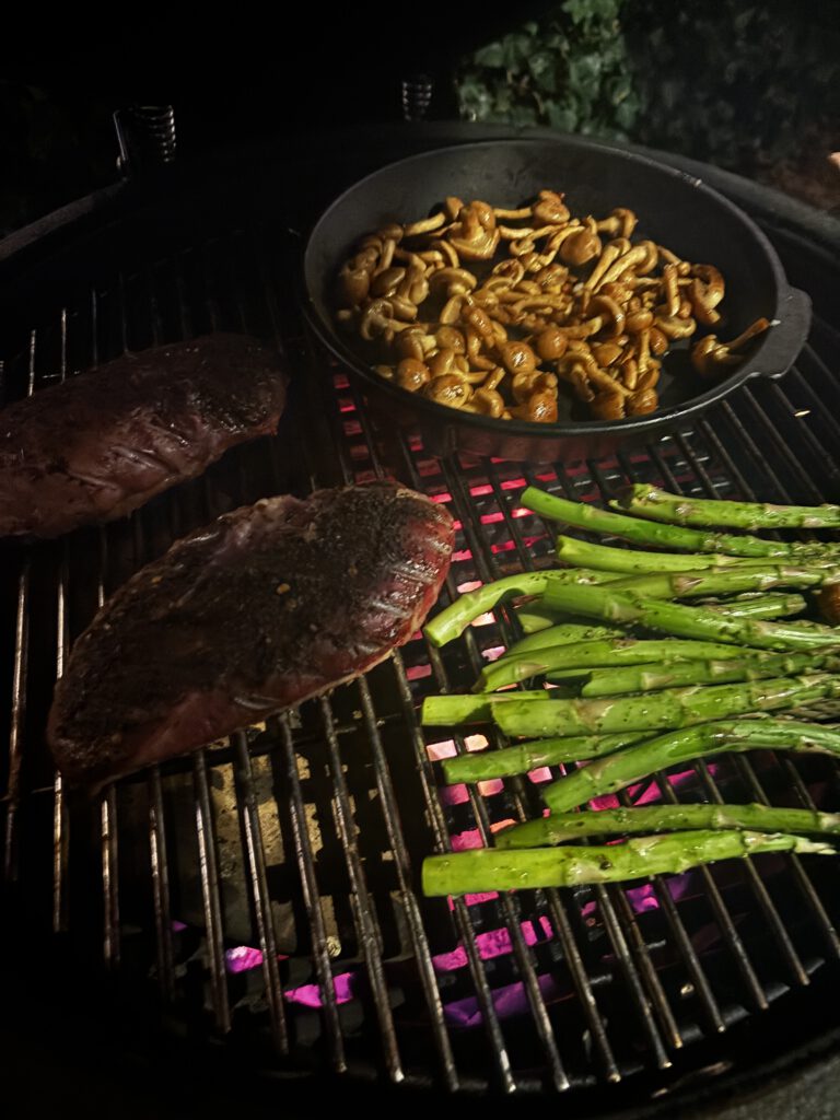 Grill de plakken boven direct vuur tot duidelijke grillstrepen ontstaan. Ze hoeven nog niet gaar te zijn.